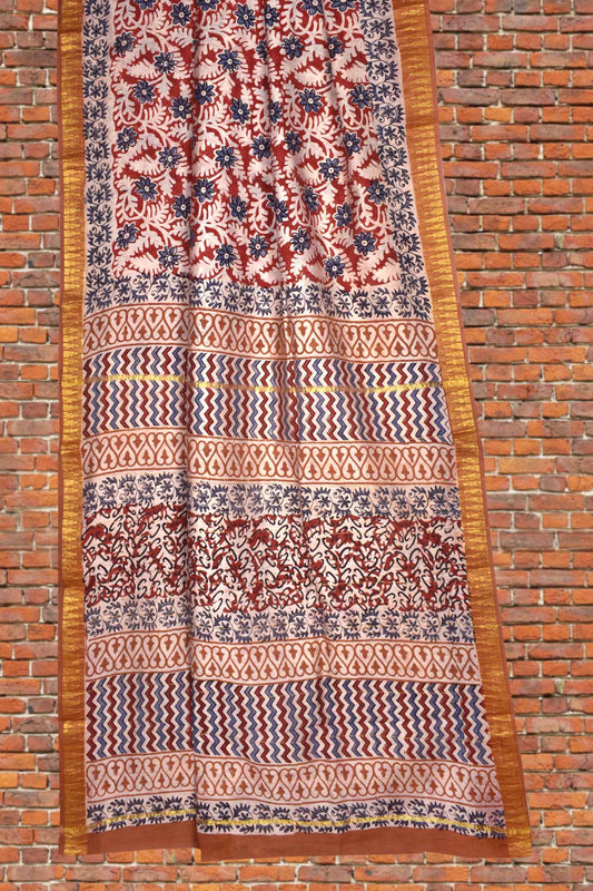 Maroon Chanderi Cotton All Over Floral HandBlock Printed Temple Border Saree