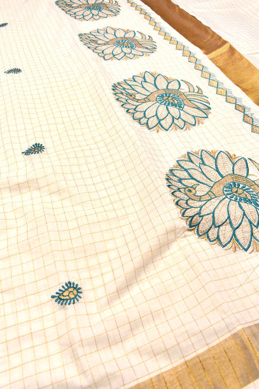 Off White Pure Kerala Cotton Checked Green Peacock Design Gold Zari Border Saree