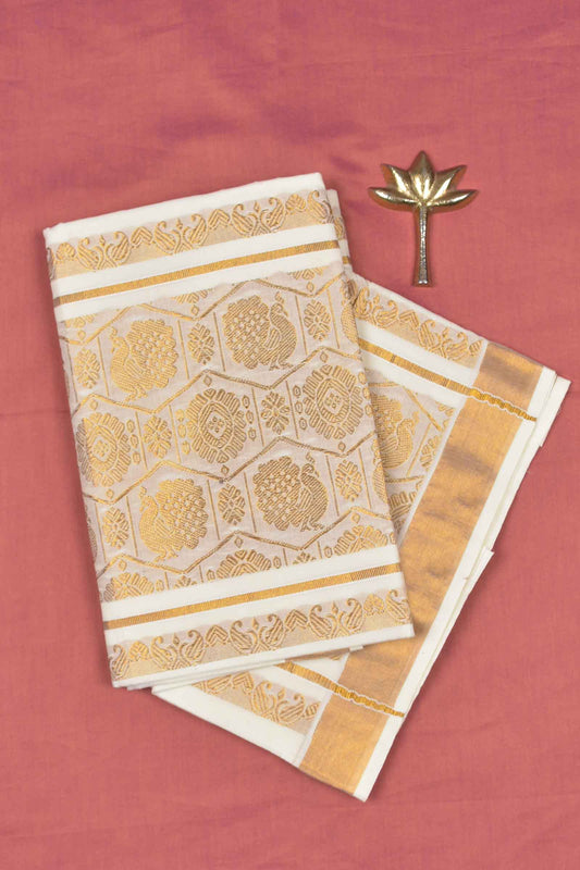 Off White Pure Kerala Cotton Line Butta Grand Golden Lotus Pallu Temple Zari Border Saree