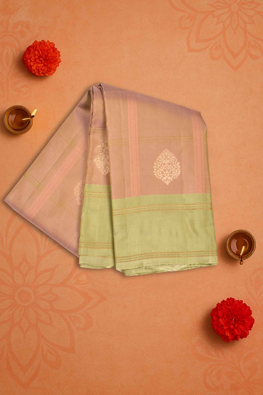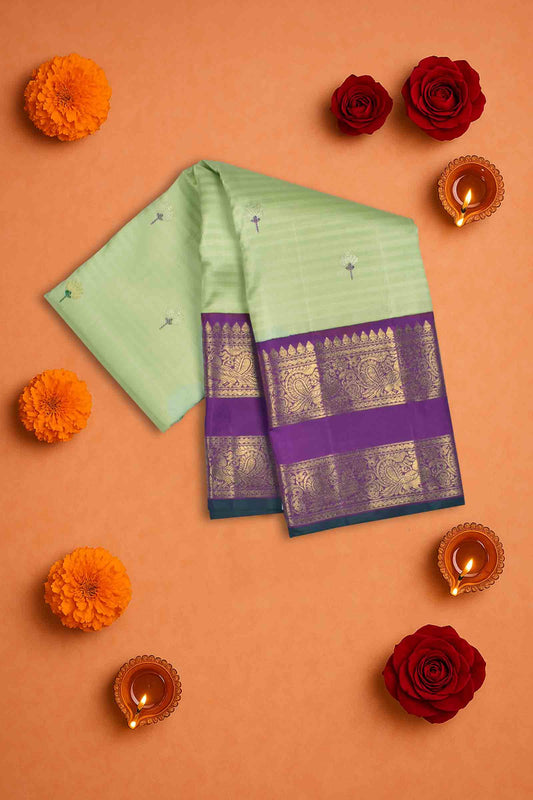 Light Green Light Weight Pure Silk Flower Butta Contrast Voilet Peacock Border Pallu Saree NAA154