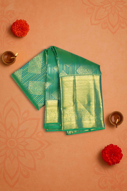 Green Light Kanchipuram Bridal Pure Silk Fancy Print Aqua Blue Peacock Border Saree NAA178