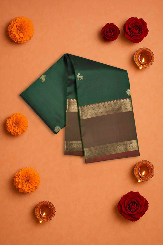 Green Light Weight Pure Silk Butta Zari Border Grand Golden Tree Peacock Elephant Pallu Saree NAA151