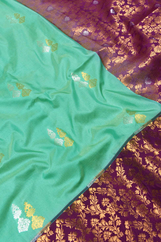 Light Green Double Jari Butta Purple Contrast Kottanj Border Semi Soft Silk Saree