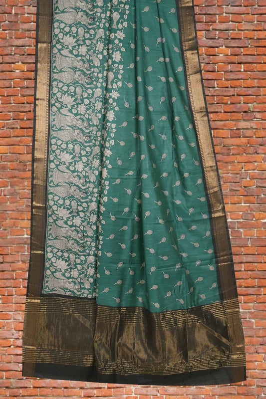 Green Bengal Cotton Floral Kalamkari Style Zari Border Saree