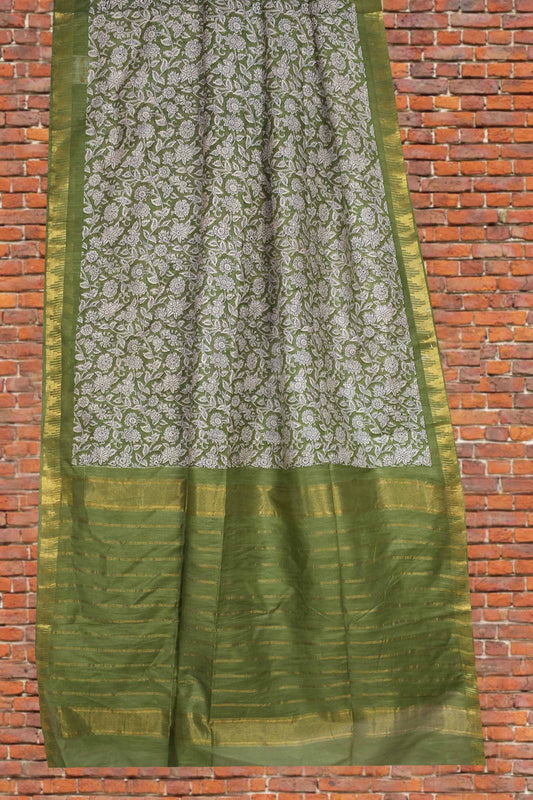 Olive Green Bengal Cotton Floral Kalamkari Style Zari Border Saree
