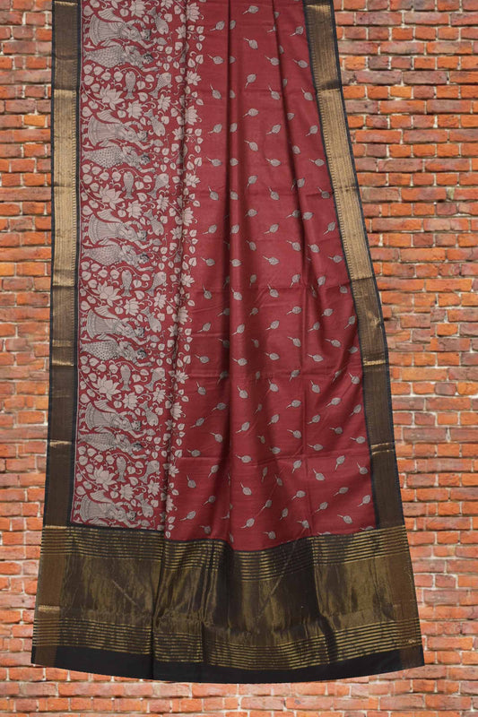 Brown Bengal Cotton Floral Kalamkari Style Zari Border Saree