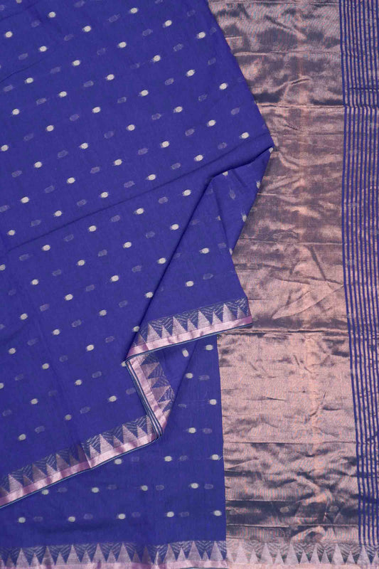 Navy Blue Soft Bengal Cotton Mini Polka Butta Block Temple Border Zari Pallu Saree