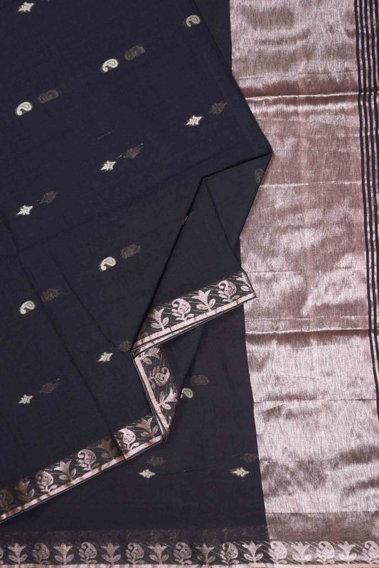 Black Soft Bengal Cotton Mini Cocoa Butta Block Zari Pallu Saree