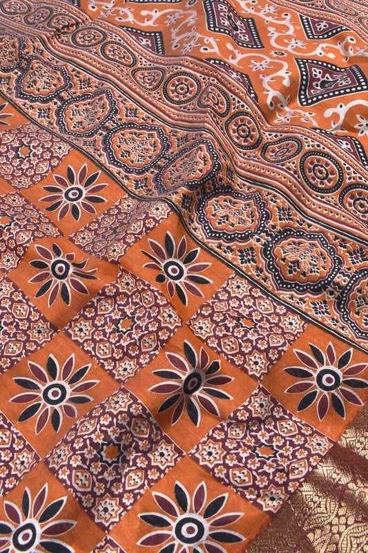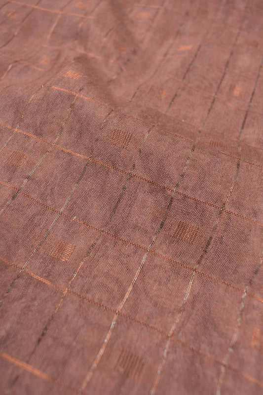 Brown Bengal Cotton Zari Checks Folk Art Border Saree