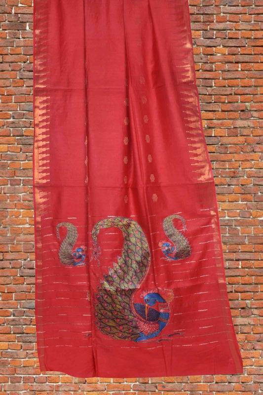 Deep Red Bengal Cotton Fancy Butta Peacock Applique Pallu Saree