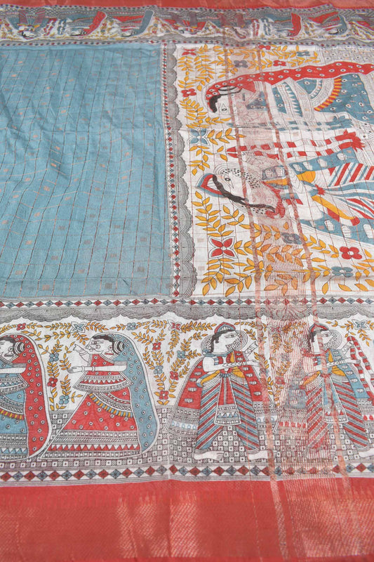 Grey's Blue Bengal Cotton Zari Checks Folk Art Border Saree