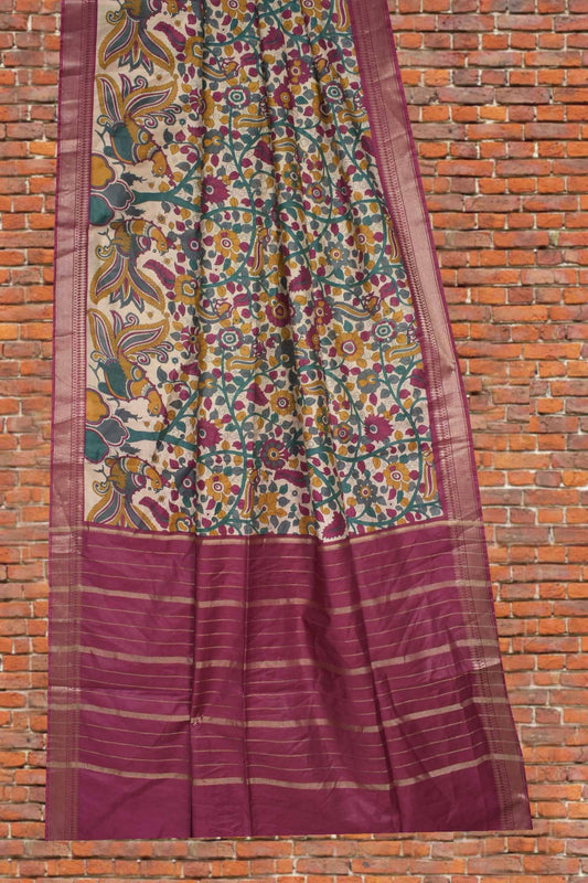 Off White Bengal Cotton Floral Kalamkari Style Peacock Pink Zari Border Saree