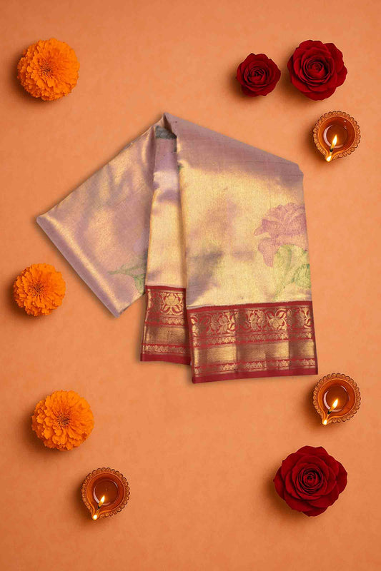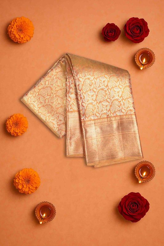 Golden Tissue Pastel Orange Kanchipuram Bridal Pure Silk Golden Florals Zari Border Pallu Saree NAA173