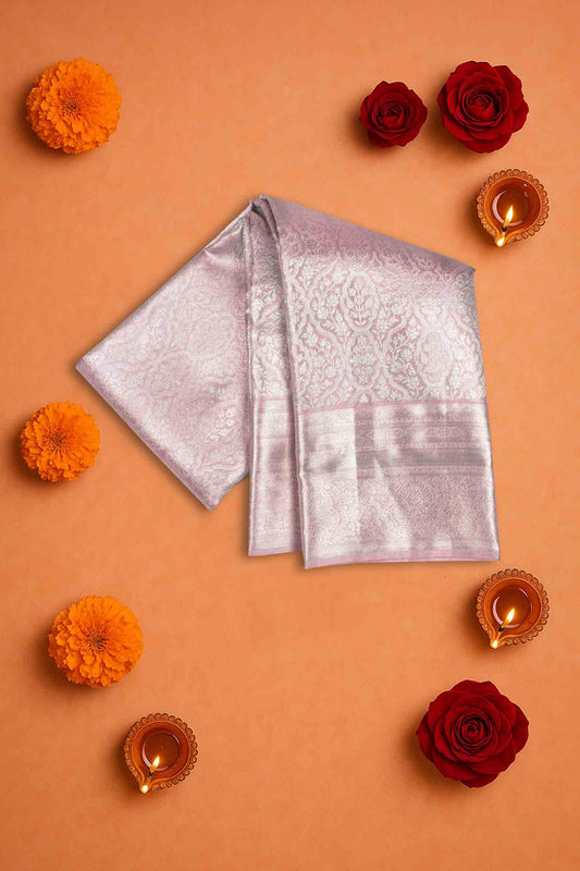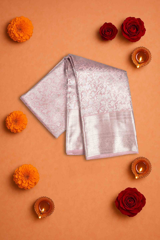 Pastel Pink Tissue Kanchipuram Bridal Pure Silk Silver Floral Silver Zari Border Pallu Saree NAA125