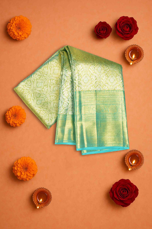 Golden Green Tissue Kanchipuram Bridal Pure Silk Rich Body Self Zari Border Saree NAA162