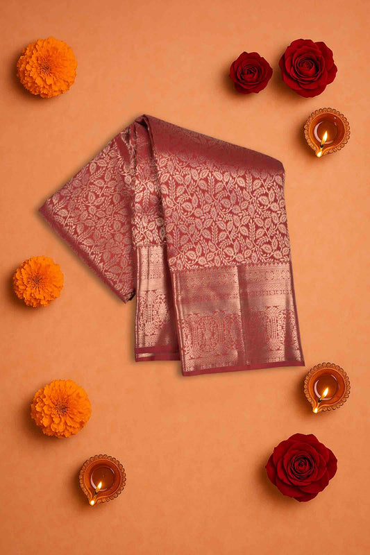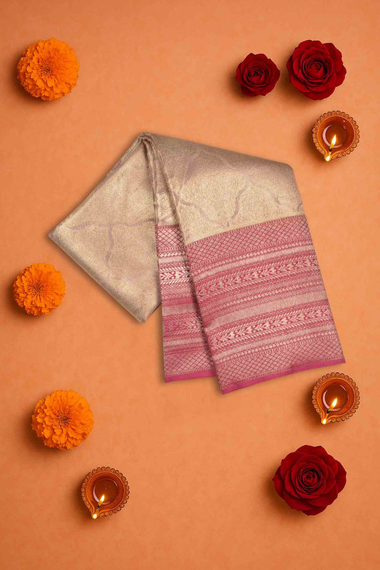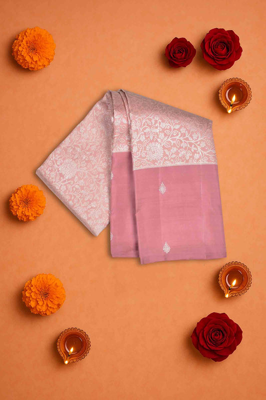 Light Pink Kanchipuram Bridal Pure Silk Silver Florals Mauve taupe Border Pallu Saree NAA167