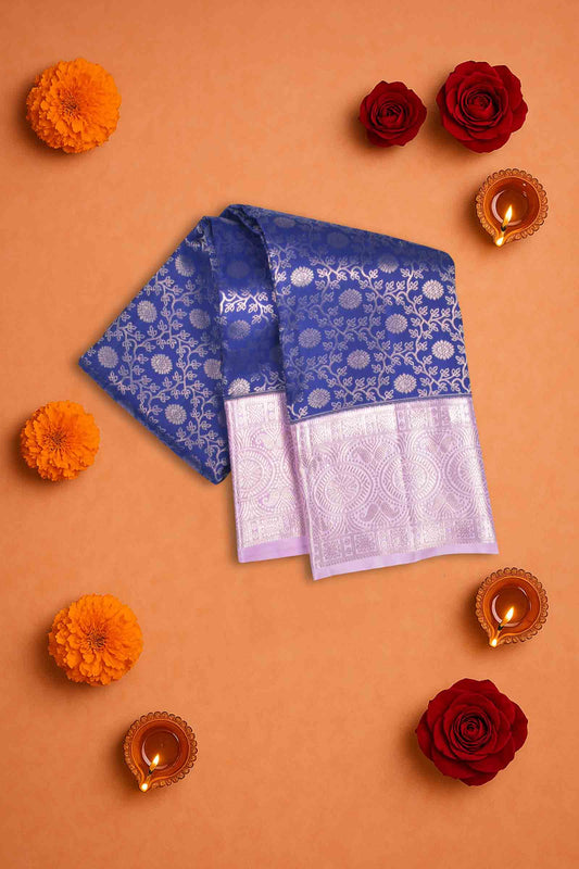 Navy Blue Kanchipuram Bridal Pure Silk Intricate Floral Jaal Light Violet Zari Border Pallu Saree NAA168
