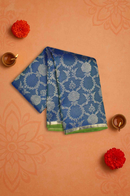 Navy Blue Kanchipuram Bridal Pure Silk Floral Zari Fancy Print Green Zari Border Saree NAA144
