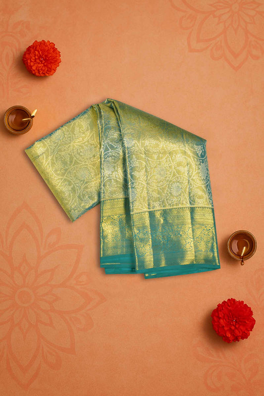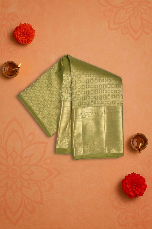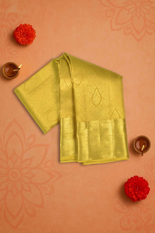 Golden Light Green Kanchipuram Bridal Pure Silk Zari Lines Zari Flowers Border Pallu Saree NAA141