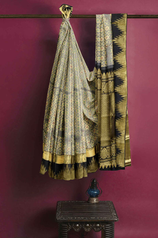 Grey Kanchipuram Bridal Pure Silk Multi Color Butta Body Tower Border Black Contrast Pallu Saree