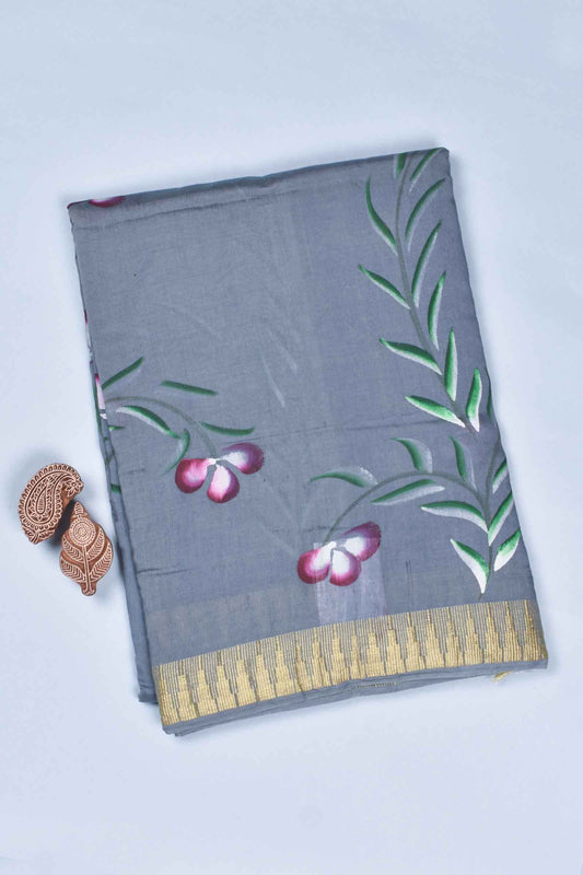 Grey Chanderi Cotton Contrast Florals Hand Painted Saree