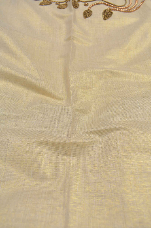 Off White Kerala Tissue Cotton Chudithar Material Aari Work Top Plain Bottom Golden Lines Dupatta Suit