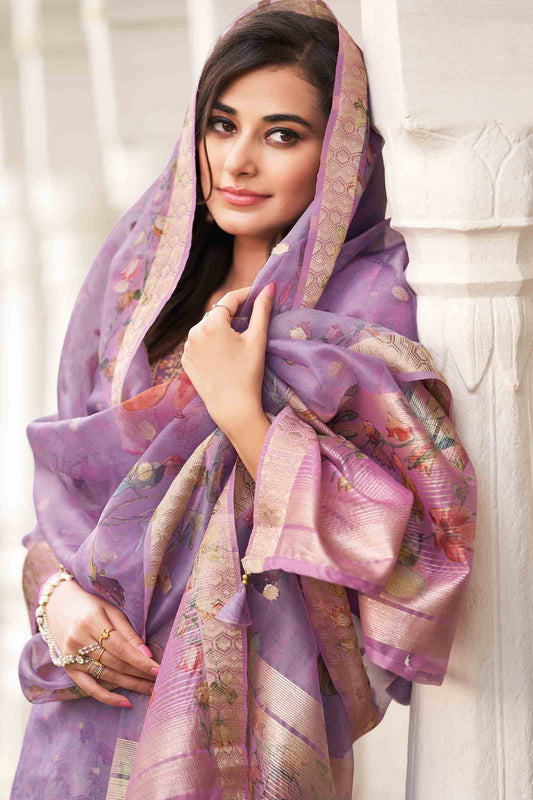 Light Violet Organza Jari Butta Chudithar Dress Material Printed Dupatta Suit
