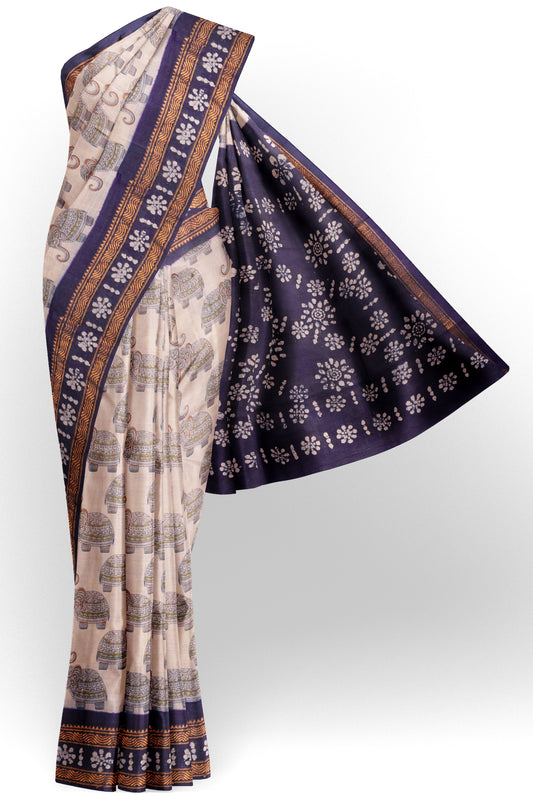 Off White Pure Sungudi Cotton Elephant Prints Star Border Saree NAA244