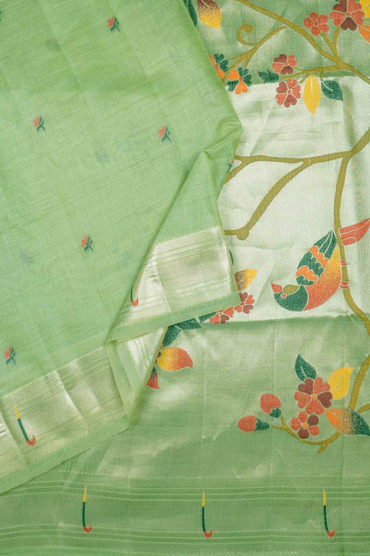 Light Pista Green Pure South Cotton Long Paisely Butta Saree NAA240