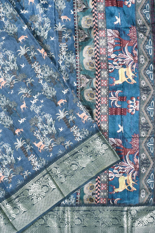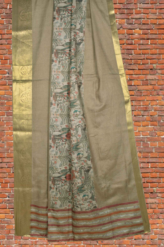 Light Brown Semi Dola Forest Scenes Mini Checks Printed Golden Border Saree