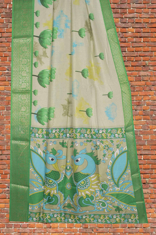 Light Green Semi Dola Green Tulip Kalamkari Pallu Saree