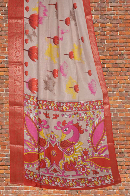 Off White Semi Dola Red Tulip Kalamkari Pallu Saree