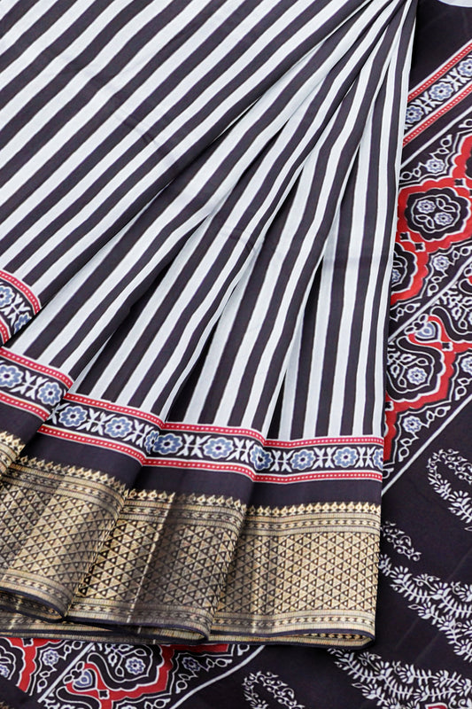 Black With White Semi Dola Zari Border Ajrakh Pallu Saree