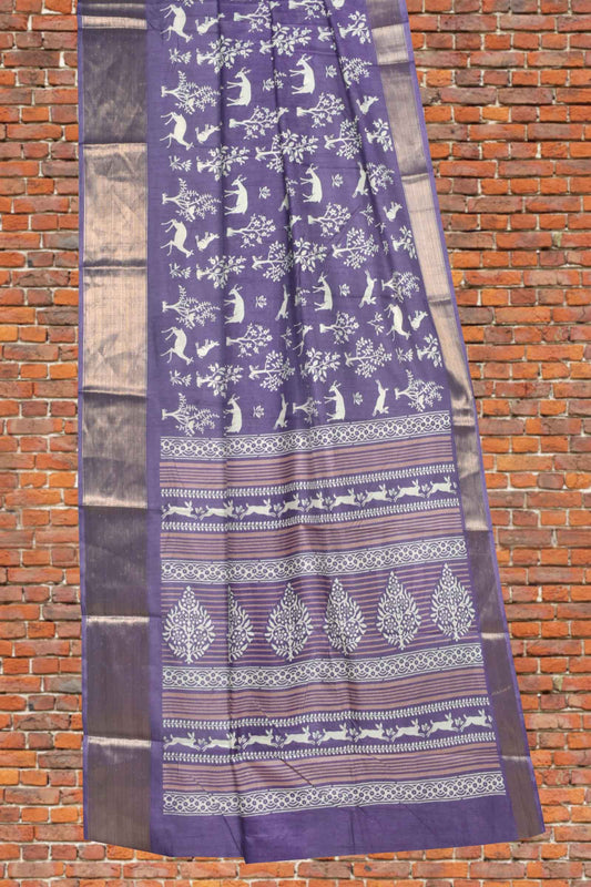 Violet Semi Dola Forest Scenes Printed Zari Border Saree
