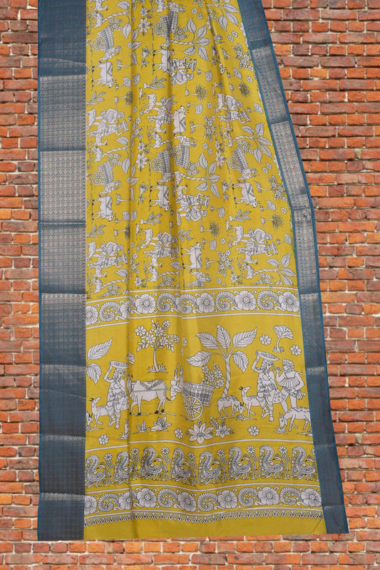Yellow Semi Dola Folk Scene printed Contrast Border Saree