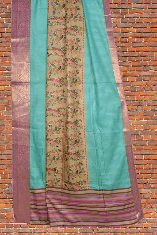 Blue Semi Dola Midway Parrots Mini Checks Printed Golden Pink Border Saree
