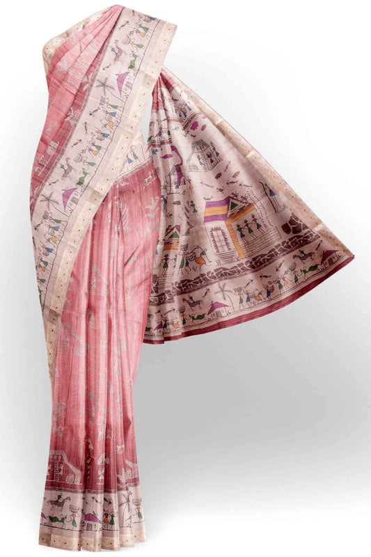 Black With Pink Semi Tussar Mystical Garden Peacock Pallu Saree