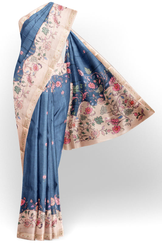 Blue Semi Chanderi Fancy Floweret Contrast Pallu Saree