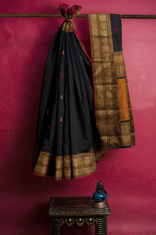 Black Kanjivaram Pure Cotton Handloom Multicolor Paisely Butta Saree