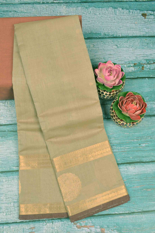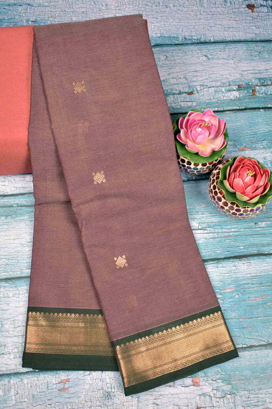 Sandal With Grey Shade Kanjivaram Pure Cotton Zari Border Peacock Butta Zari Pallu Saree