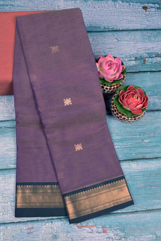 Light Voilet Kanjivaram Pure Cotton Butta Contrast Border Zari Pallu Saree