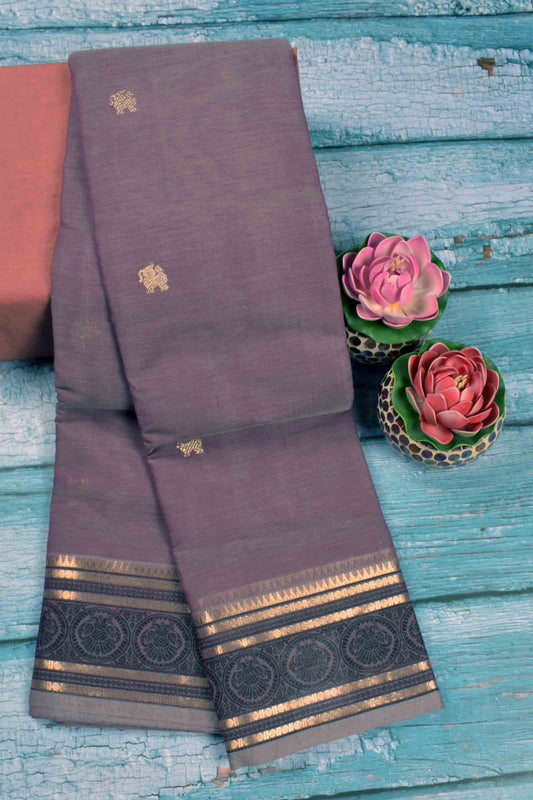 Grey Kanjivaram Pure Cotton Kattam Lotus Butta Zari Pallu Saree