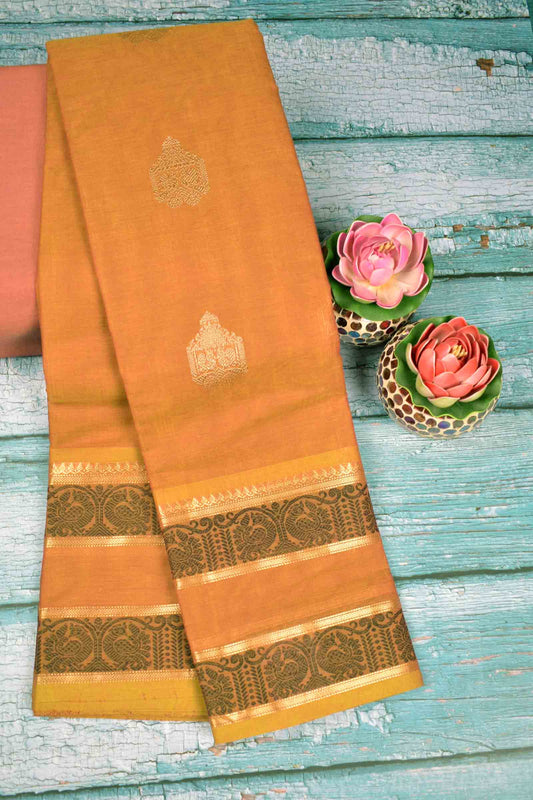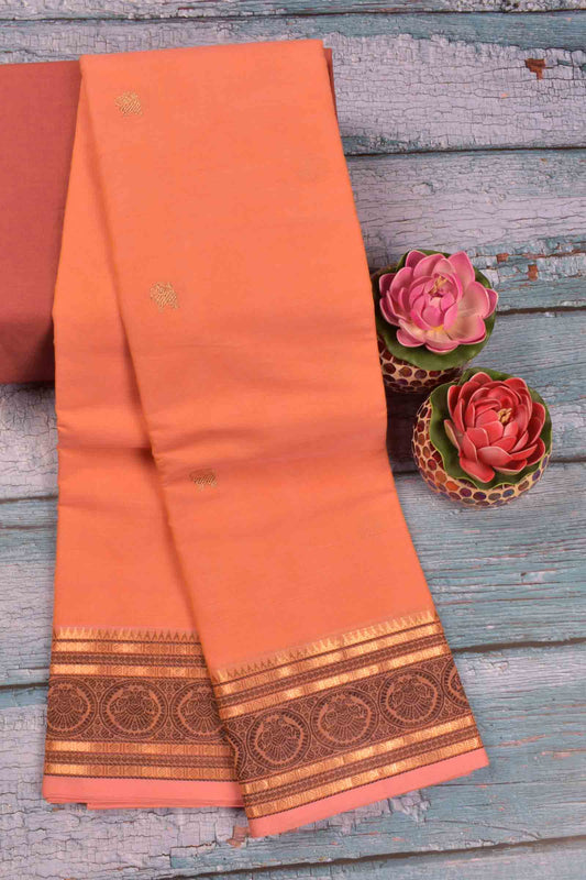 Peach Kanjivaram Pure Cotton Yazhi Butta Black Zari Border Pallu Saree
