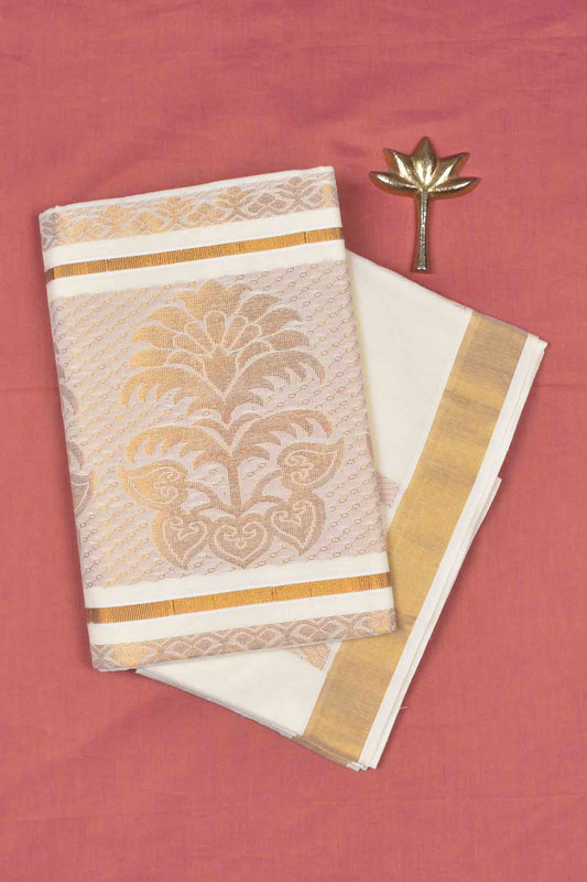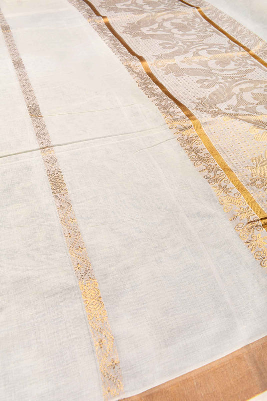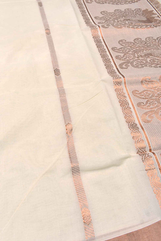 Off White Pure Kerala Cotton Peacock Pallu Copper Zari Saree