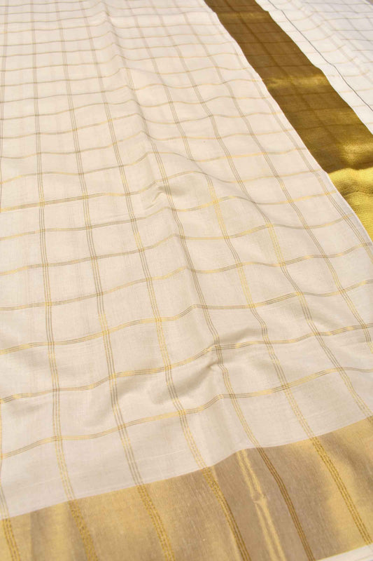 Off White Pure Kerala Cotton Checked Gold Zari Border Saree
