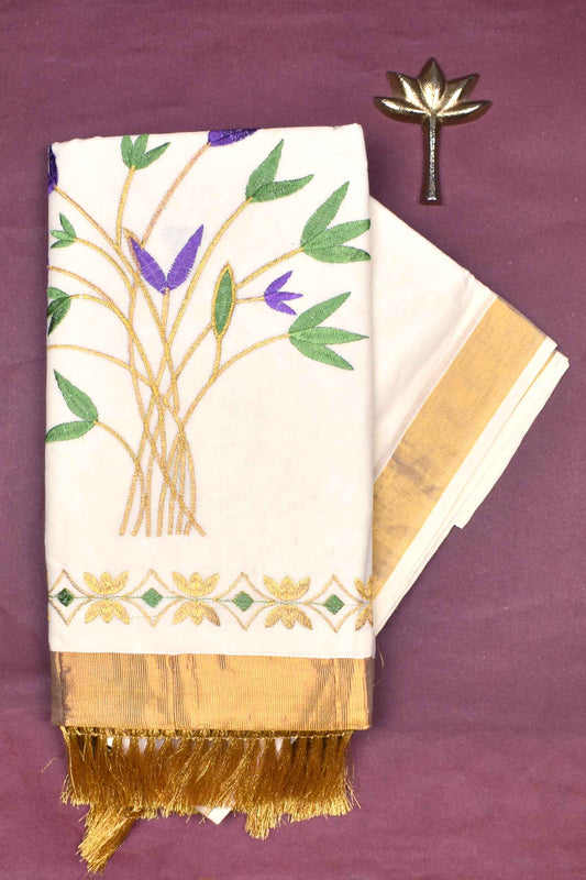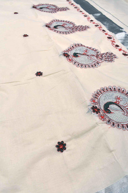 White Pure Kerala Cotton Peacock Embroidery Silver Border Saree