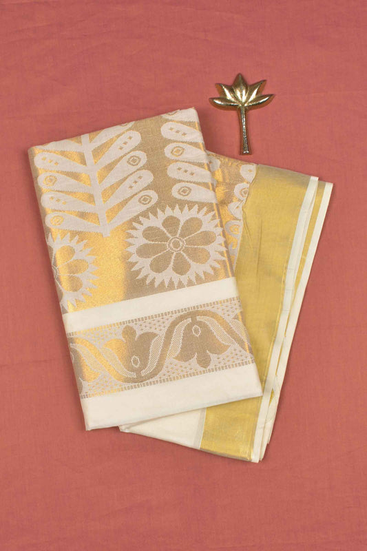 Off White Pure Kerala Cotton Zari Lines Butta Golden Zari Border Floral Tree Pallu Saree