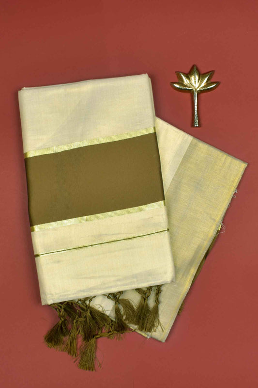 Off White With Brown Border Kerala Tissue Cotton Golden Zari Line Saree