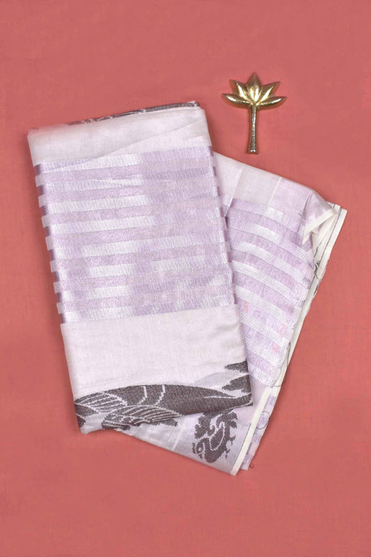 Silver With Violet Kerala Tissue Cotton Contrast Peacock Butta Violet Zari Lines Peacock Pallu Saree