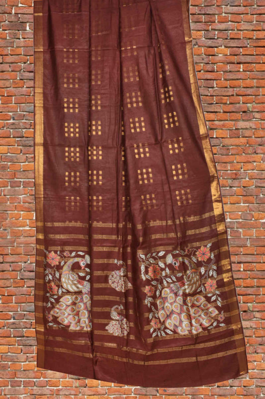 Brown Bengal Cotton Fancy Butta Peacock Applique Pallu Saree